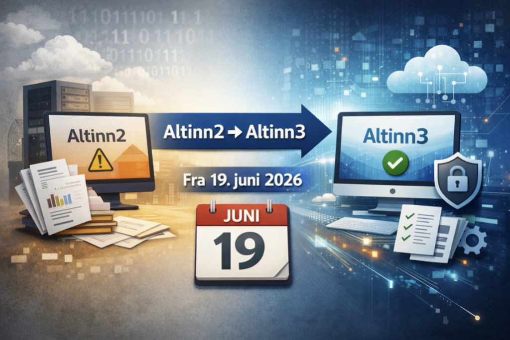 Fra og med 19. juni 2026 stenges dagens Altinn-plattform (kalt Altinn2), og all rapportering skal foregå på den nye plattformen Altinn3.
